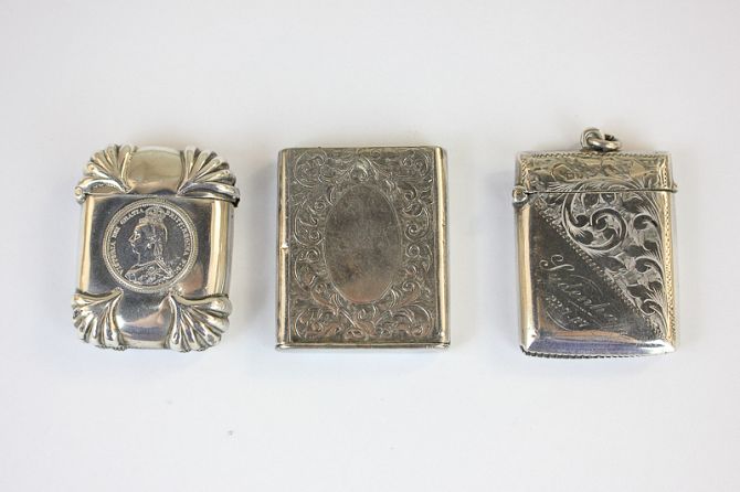 A Victorian silver vesta case inset with a sixpenny coin, a Victorian silver vesta case, maker John Millward Banks, Birmingham 1891, and an Edwardian silver vesta case, Chester 1906, 2oz
