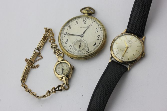 A gentleman`s 9 carat gold Enicar wrist watch; a lady`s 9 carat gold Roamer bracelet watch and a gold plated Waltham open face pocket watch