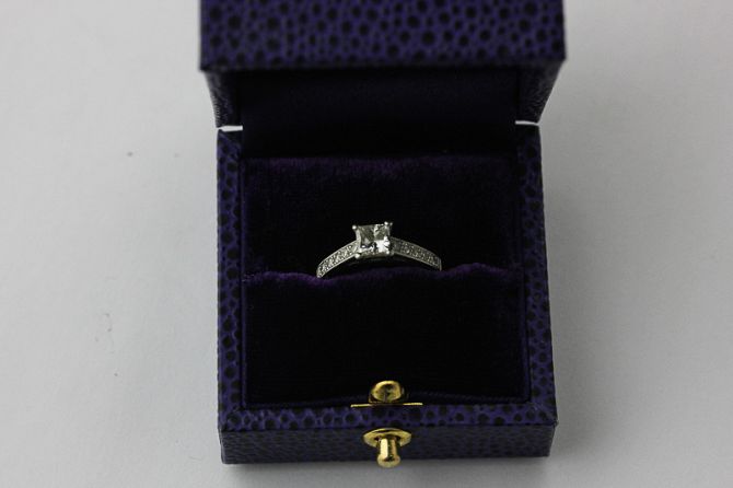 A diamond single stone ring, the princess cut stone four claw set with smaller stones to the shoulders, on platinum band