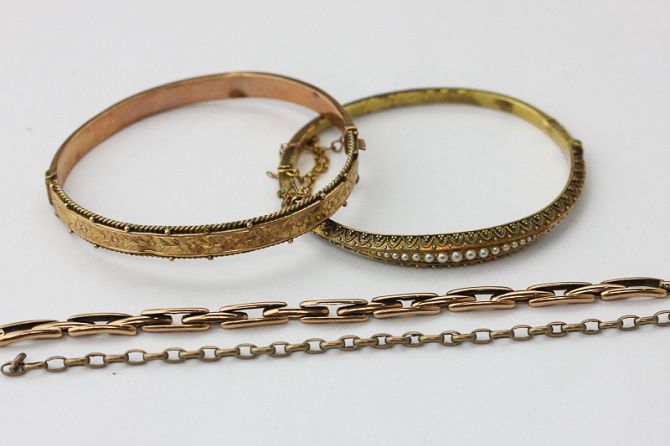 A 9ct gold bangle, a gold and split pearl bangle, and two gold chains, 21.4g gross