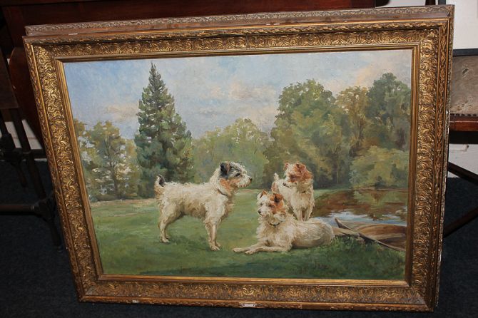 E F Weever, three terriers beside a lake, boat moored alongside, 'Jock, Jill and Jane', oil on canvas, signed, 49cm by 67.5cm
