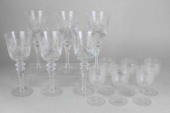 A set of six engraved sherry glasses, decorated with spiders, butterflies, grasses and leaves, 12cm high, together with a set of six cut glass wine goblets, 20.5cm high
