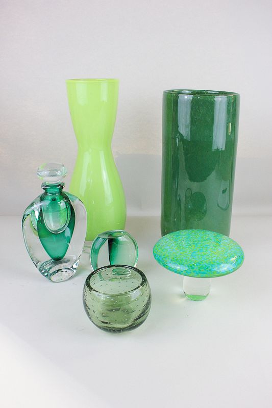 A Monart style green glass cylindrical vase, 28cm high, a lime green glass vase, a bubble glass dish, a perfume bottle and stopper and matching vase, and a speckled green glass model of a toadstool, 13cm