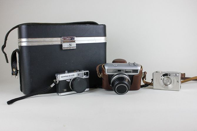 A Carl Zeiss Jena Werra 3 camera in fitted Werra leather case, an Olympus 35 ECR camera and a Canon Ixus II, together with a hard Tokyo Lock camera case