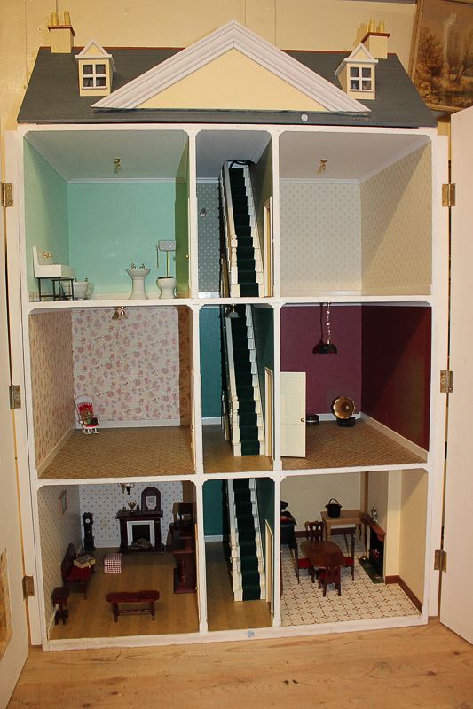 A large Georgian style doll's house, painted wood with hinged facade, assorted doll furniture and accessories, and two books on dolls' houses, house measures 114cm high