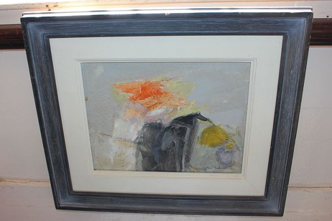 Clifford Fishwick (1923-1997), abstract composition, oil on board, signed and dated 74, 20.5cm by 26.5cm