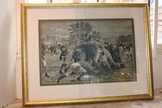 A collection of three coloured prints including after W B Wollen, boys playing rugby, 31cm by 47.5cm (a/f - two glasses cracked)