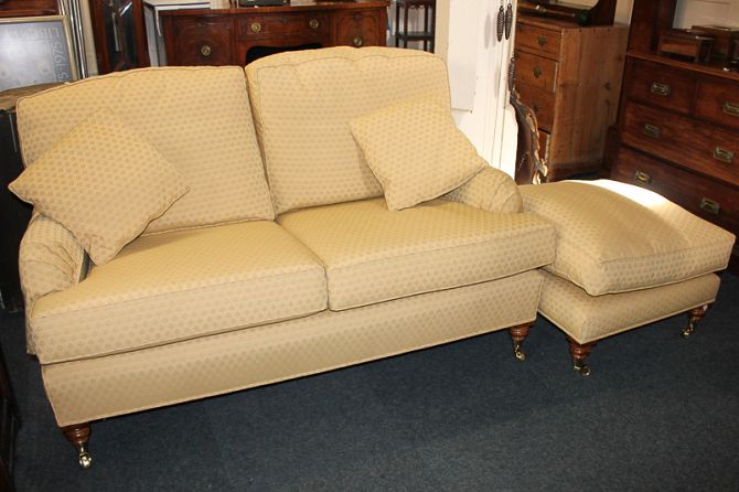 An Ashley Lawrence two seater settee, in gold patterned upholstery, with matching upholstered stool, on turned feet with brass castors, 149cm