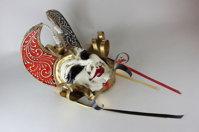 A Venetian carnival jester's face mask, wearing a scrolled collar and pointed hat decorated with bells and ribbons, Valentina Pereno label and certificate verso