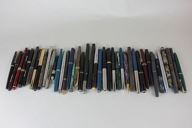 A large collection of fountain pens and propelling pencils, including Parker, Conway, Waterman's, Iridium and Burnham, some with gold nibs