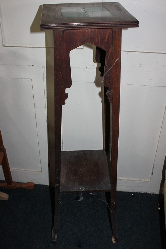 An Edwardian jardiniere stand, square top with two-tone coloured four-tile inset, 105cm high