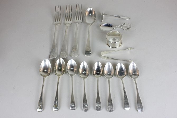 A set of three George III silver teaspoons, maker Thomas Northcote, London 1793, together with five other various silver teaspoons, three table forks, pair of tongs, dessert spoon, spoon, pusher and napkin ring, 15.5oz