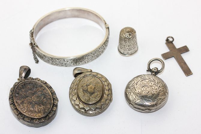 A silver bangle; sovereign case; two lockets; thimble and a cross