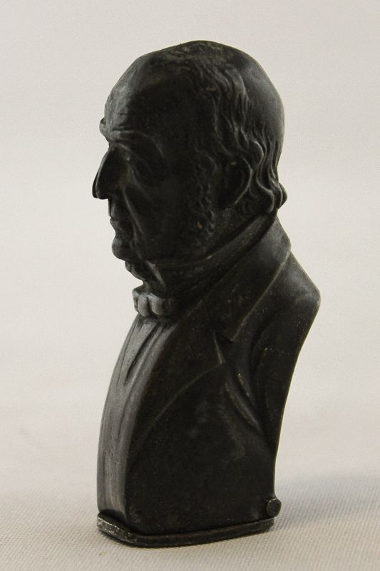 A metal late 19th century vesta case modelled as head and shoulders of a man, with hinged base strike, 5.4cm high