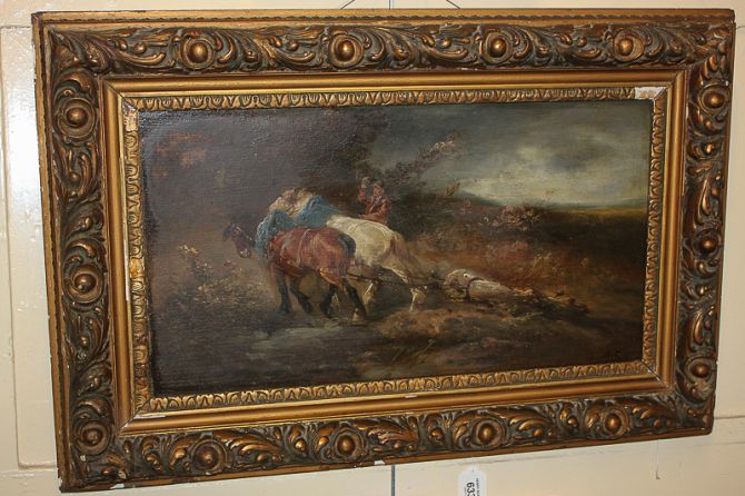 H Schouten, rural scene depicting two shire horses dragging a felled tree beside a farmer, oil on panel, signed, 28.5cm by 53cm