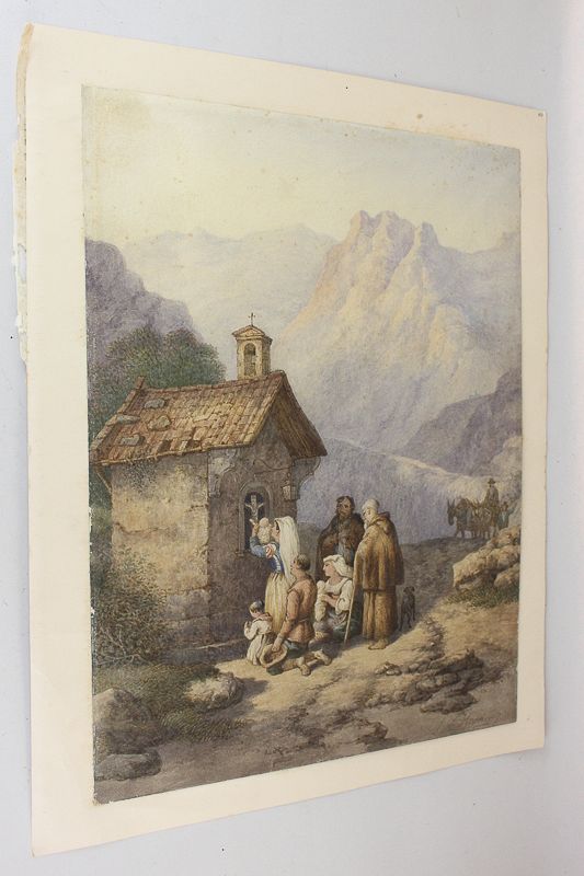 A 19th century watercolour of a mountainous landscape with figures kneeling beside a shrine, faint signature J* Harding, bears signature, JD Harding verso, 37.5cm by 29cm, unframed