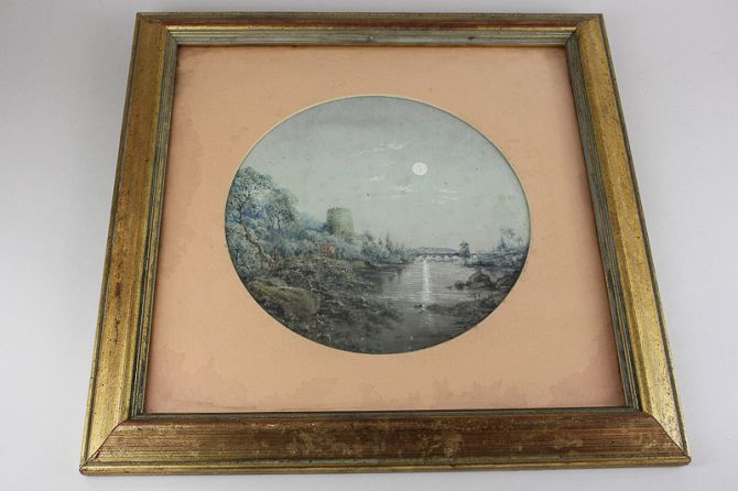 19th century English school, moonlit landscape with aqueduct and wooded river beside a tower, under a full moon, tondo, watercolour, 20.5cm diameter
