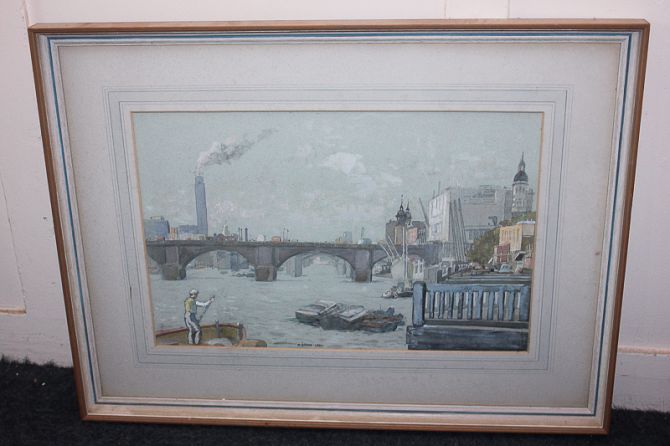 Mabel Bruce Low RBA VP SWA, view across the Thames, Old London Bridge, watercolour, signed, Royal Institute Galleries label and other paper labels verso, 31cm by 47.5cm