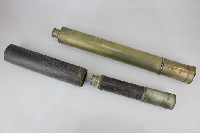 A brass two-tube telescope marked W Atkin, Newcastle on Tyne, extends to 98cm, and a leather mounted military three-tube telescope, inscribed Dallmeyer, London, dated 1870, in leather case (a/f)