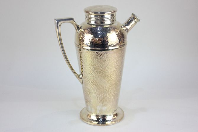 A silver plated cocktail shaker jug with screw cap, spout and hammered effect decoration, stamped Universal, USA, 27cm