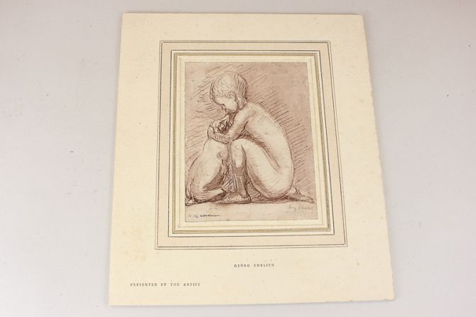 After Georg Ehrlich (1897-1966), child crouching with dog, drypoint etching, signed in pencil, mount printed with the artist's name and presented by the artist, 15.5cm by 11.7cm, unframed, together with an unframed etching of a fishing boat, after Briscoe, 12.5cm by 17.5cm