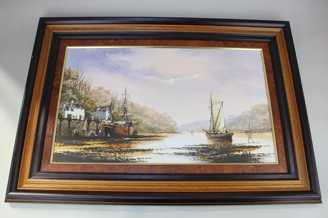 Ken Hammond (20th century), wooded river landscape with boats, figure beside two cottages on the shore, acrylic on canvas, signed, 29.5cm by 49.5cm