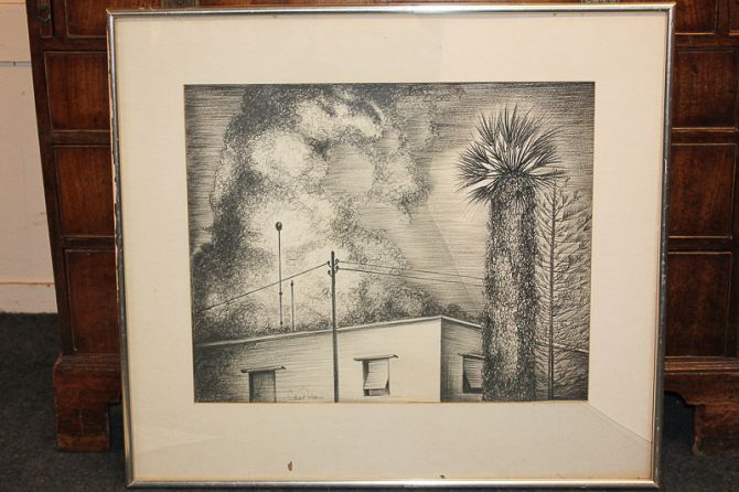 Edward Toledano (20th century), view of smoke rising from the top of a building, trees foreground, charcoal, signed in pen, 48cm by 60cm, (a/f - damaged frame)