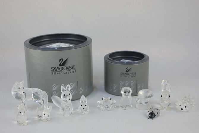A Swarovski crystal wolf ornament, 5.5cm high, boxed, and an owl, boxed, a fox and cub, a hedgehog, a ladybird, a squirrel, a frog, a toadstool, and two rabbits (11)