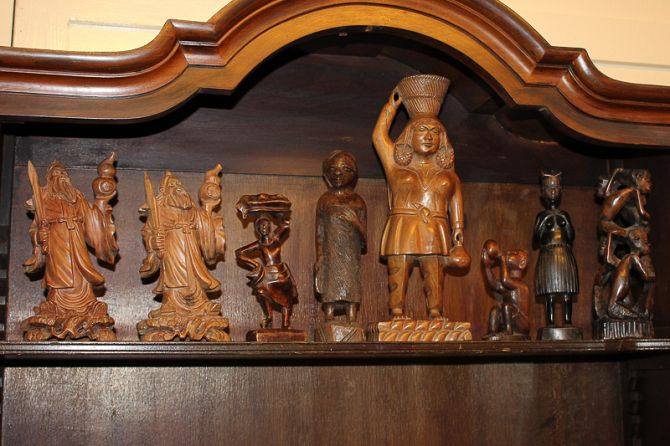 Ethnographic interest, a collection of eight various carved wood figures, including a pair of Japanese bearded men, each holding a sword and a gourd, 22cm high
