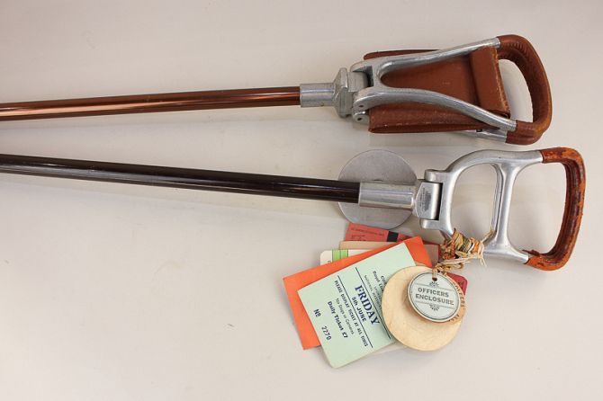 Two shooting sticks, one with leather seat, 86cm
