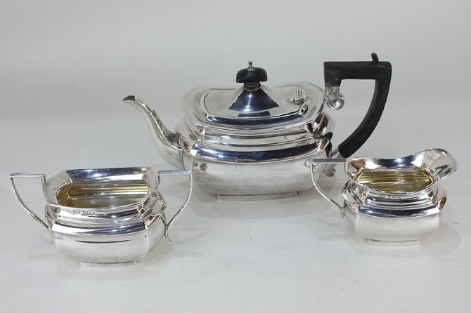 A George V silver three-piece tea set, rectangular form with teapot, sugar bowl and cream jug, maker J B Chatterley, Birmingham 1913, 18oz