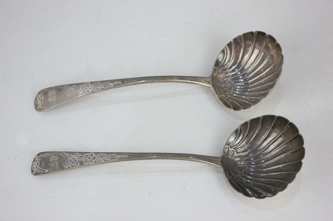 A pair of Irish silver sauce ladles, shell bowls, foliate engraved handles, Dublin c.1765 by Michael Keeting