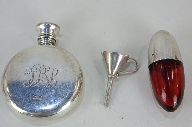 A Victorian silver mounted ruby glass scent bottle by Sampson & Mordan, London 1883, a circular silver scent bottle, maker A & J Zimmerman Ltd, Birmingham 1930, and a small silver funnel