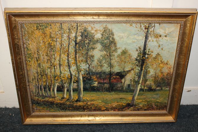 Michel Koroschansky (Russian 1866-1925), farmhouse and outbuildings seen through trees, oil on canvas, signed, 37.5cm by 53.5cm