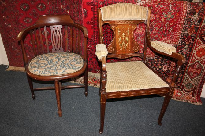 A Victorian inlaid dining chair with padded back rail, arms and seat, and an oval chair with bow shape arms and slatted supports