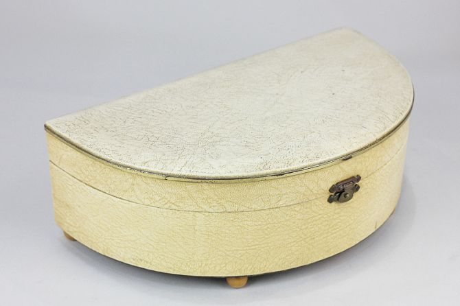 A 20th century musical jewellery box, half moon shape with figure of a dancer, with clockwork mechanism, by Reuge, 25cm