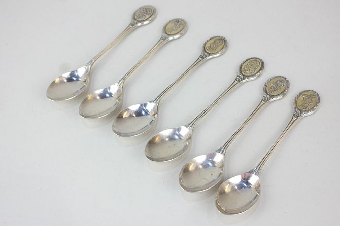 A matched part set of six Elizabeth II silver collector's spoons, maker John Pinches, Sheffield, with a different embossed flower finial, various dates, 4.5oz