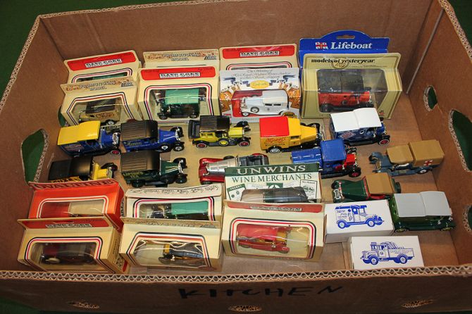 A collection of sixteen model and toy vehicles, all boxed, including Lledo Days Gone and Promotional, Corgi and Models of Yesteryear, together with twelve Matchbox and similar die cast model cars, all Matchbox Models of Yesteryear, all unboxed