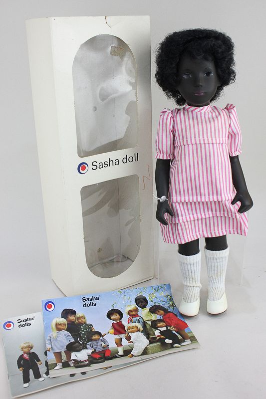 A Sasha 'Cora' doll, with black curly hair and brown eyes, no.109, in pink and white striped dress and knickers, socks and shoes, makers tag to wrist, 41cm high, with leaflets, boxed