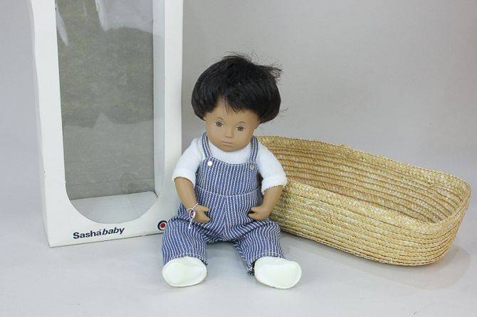 A Sasha 'Baby Doll', with brown hair and brown eyes, no. 510, in striped denim playsuit, makers tag to wrist, 30cm, with moses basket and leaflet, boxed