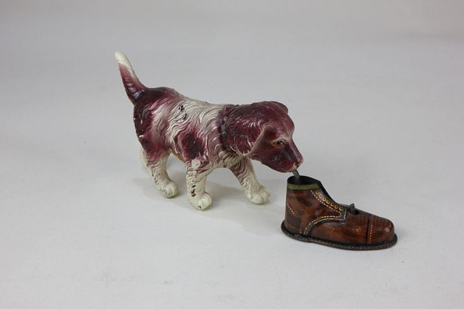 A clockwork mechanical toy formed as a dog worrying a tin plate shoe, partial paper label 'passed inspection, made in Japan', (a/f)