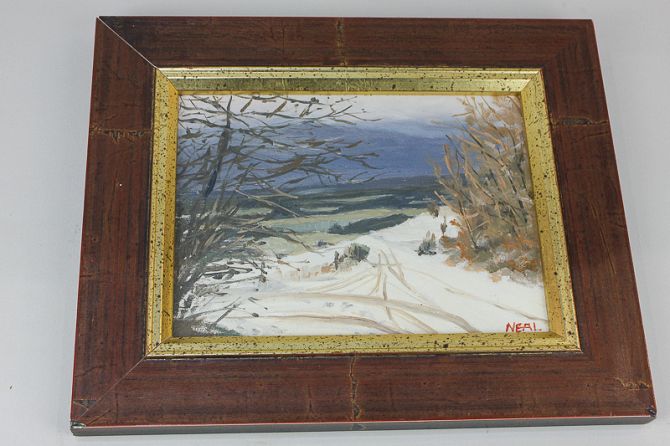 Stephen Neal, local interest, winter landscape view across fields, 'Snow at Goodwood', oil on board, signed, paper label verso, 14.5cm by 19.5cm
