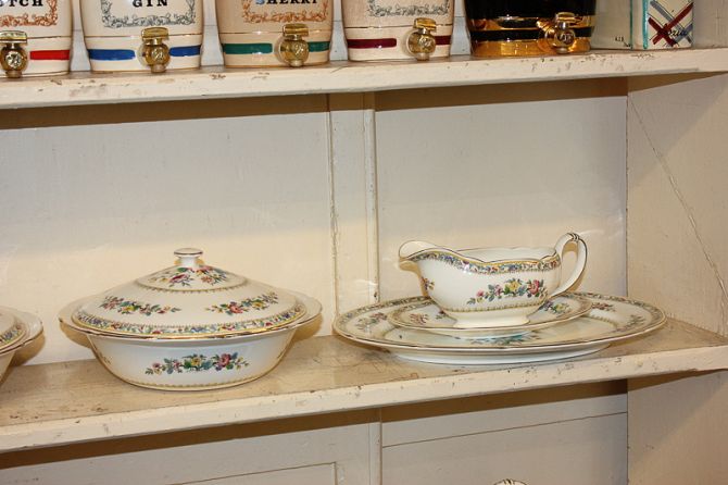 A Foley porcelain part dinner service in the Ming Rose pattern, comprising two vegetable tureens, an oval platter, a sauce boat, eight dinner and bread plates, eight dessert bowls and seven soup plates