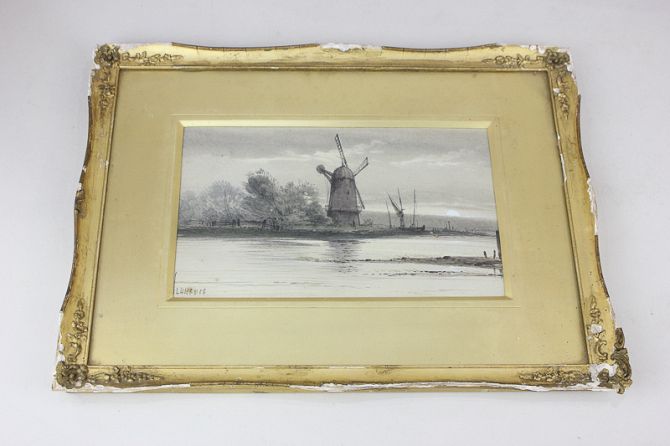 19th century school, Dutch landscape view of windmill across water at twilight, watercolour, indistinctly signed, 11.5cm by 19cm