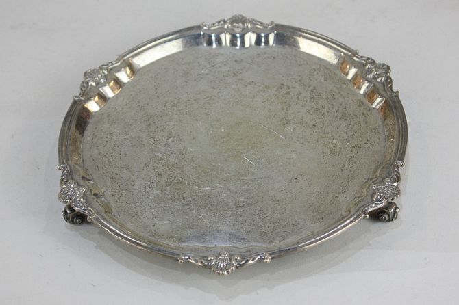 A George VI silver card tray, maker Mappin & Webb, Sheffield, 1937, with shell and scroll border on three scroll feet, 21.5cm diameter, 10oz