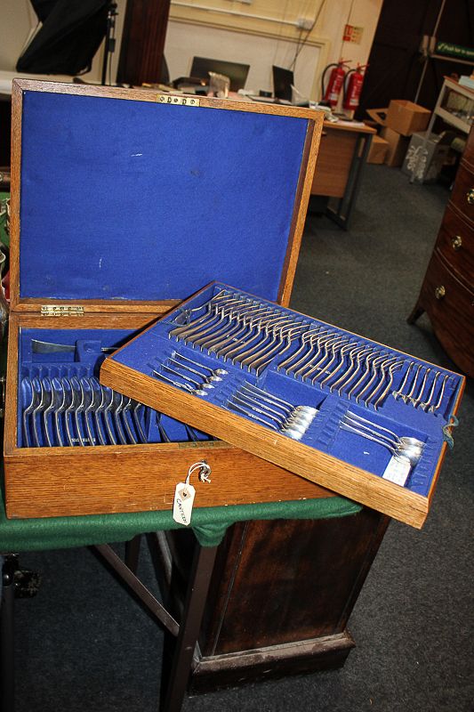 A George V silver part canteen of Old English pattern cutlery, to include twelve dinner forks, dessert forks, tablespoons, eleven dessert spoons, teaspoons, four salt spoons, three mustard spoons, two sauce ladles, a gravy spoon, soup ladle and butter knife, in fitted oak canteen case, maker George Howson, Sheffield 1911, 119oz