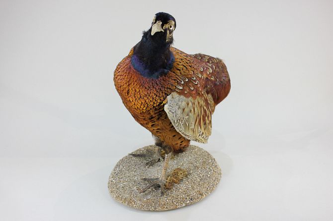 A taxidermied male pheasant mounted on gravel base, 36cm high