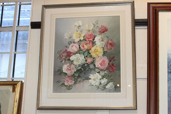 Jack Carter, still life of roses in a glass vase, watercolour, signed and dated 1989, Whibley Galleries paper label verso, 44cm by 37.5cm