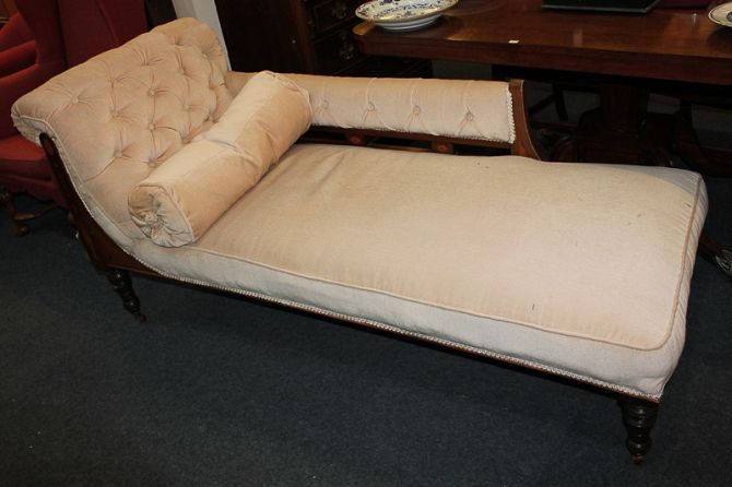 An Edwardian inlaid mahogany chaise longue with button upholstered back and side, mahogany frame inlaid with harebells, vases and paterae, on turned legs and castors, 85cm