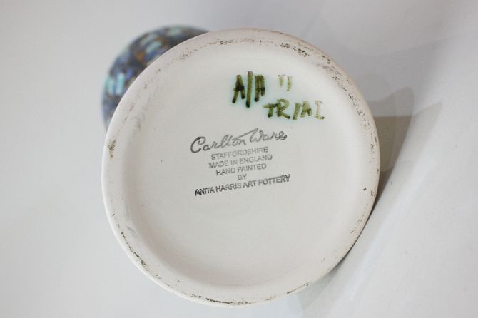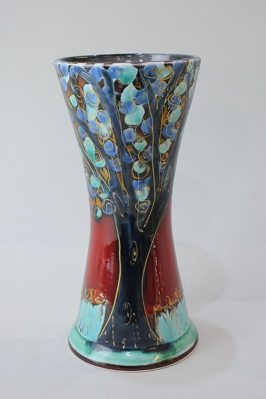 A Carlton Ware porcelain vase, a trial piece by Anita Harris depicting a blue tree on red ground, 25cm high